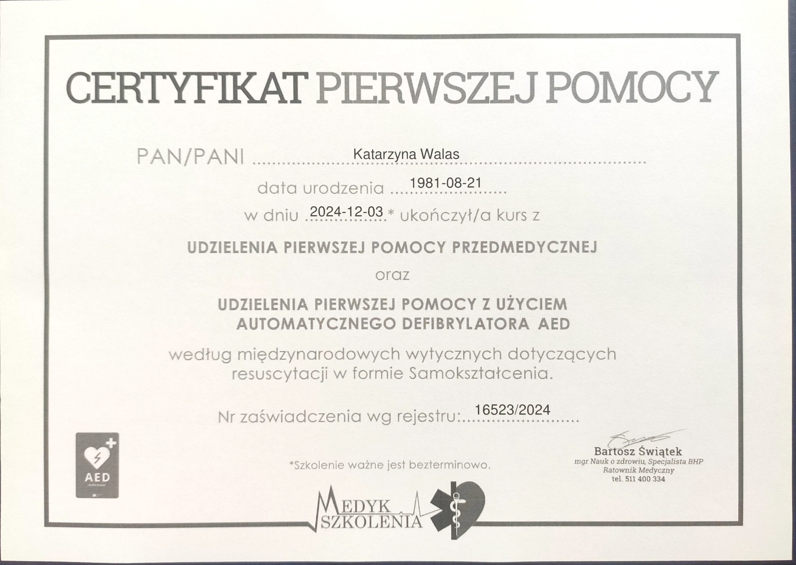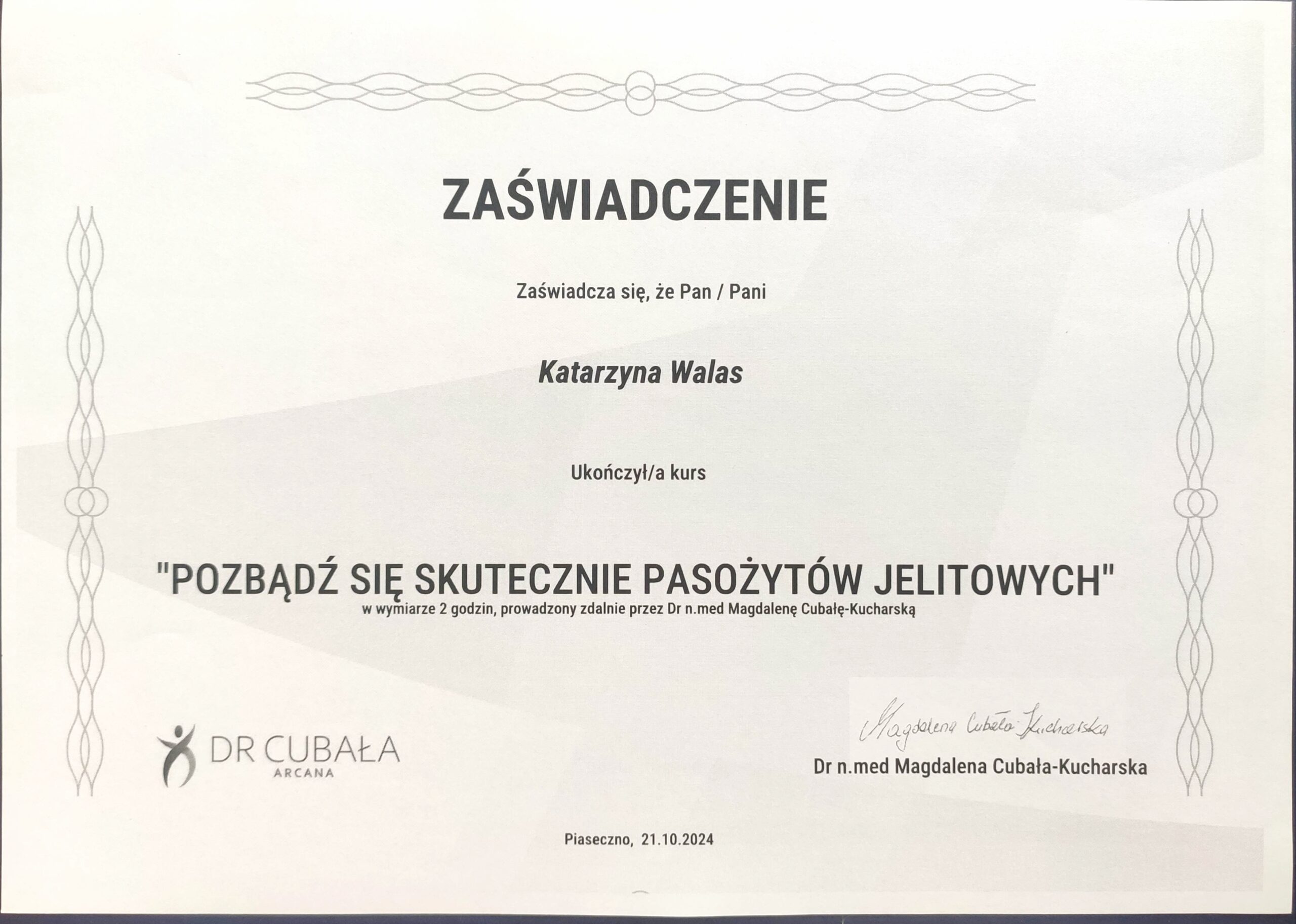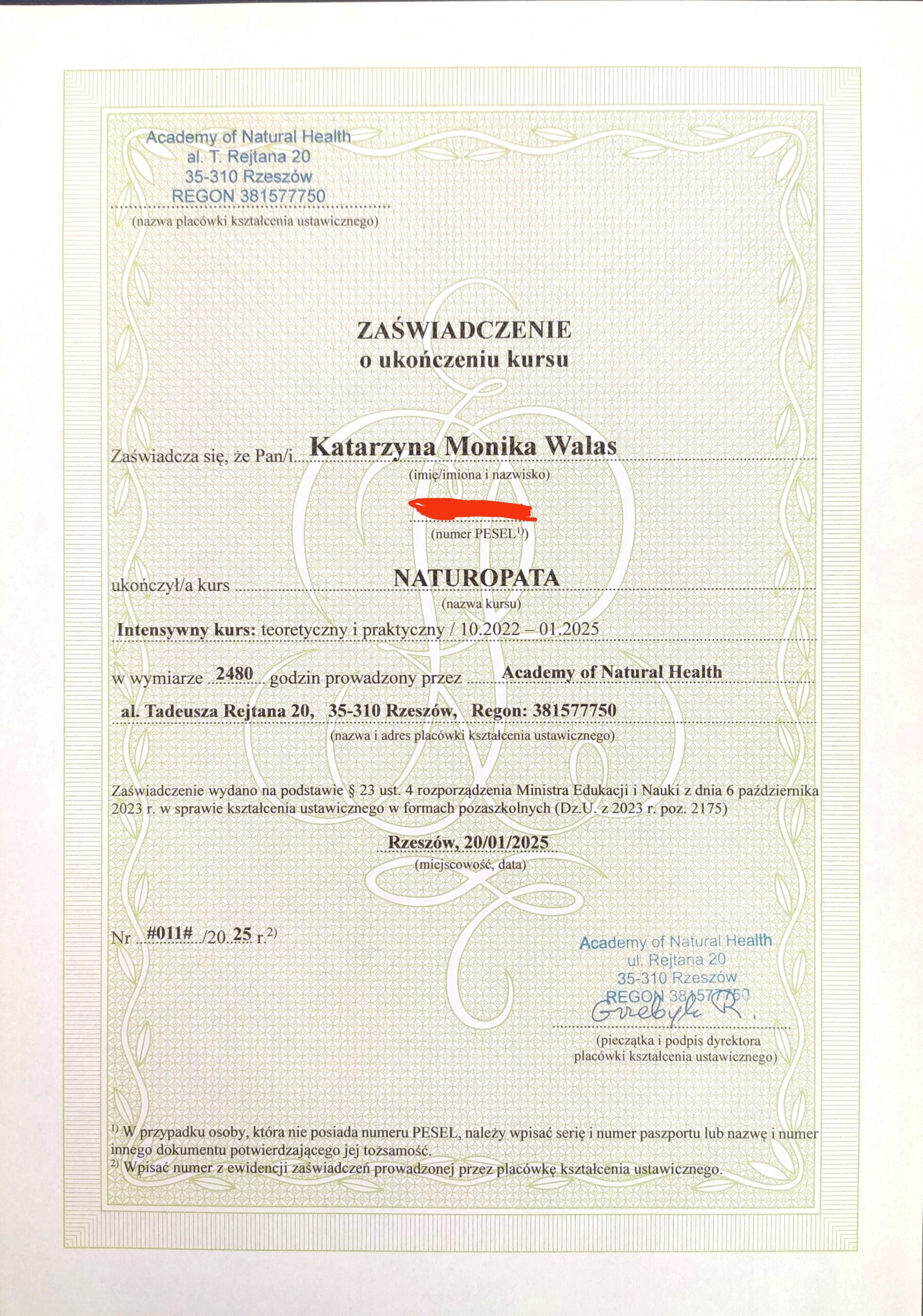 Katarzyna Walas – dyplomowany naturopata online/stacjonarnie Katowice, absolwentka szkoły Ryszarda Grzebyka Academy of Natural Health (Akademia naturopatii o kierunku przyczynowo-skutkowym) ze zdanym egzaminem państwowym z naturopatii oraz studiów podyplomowych z dietetyki klinicznej.