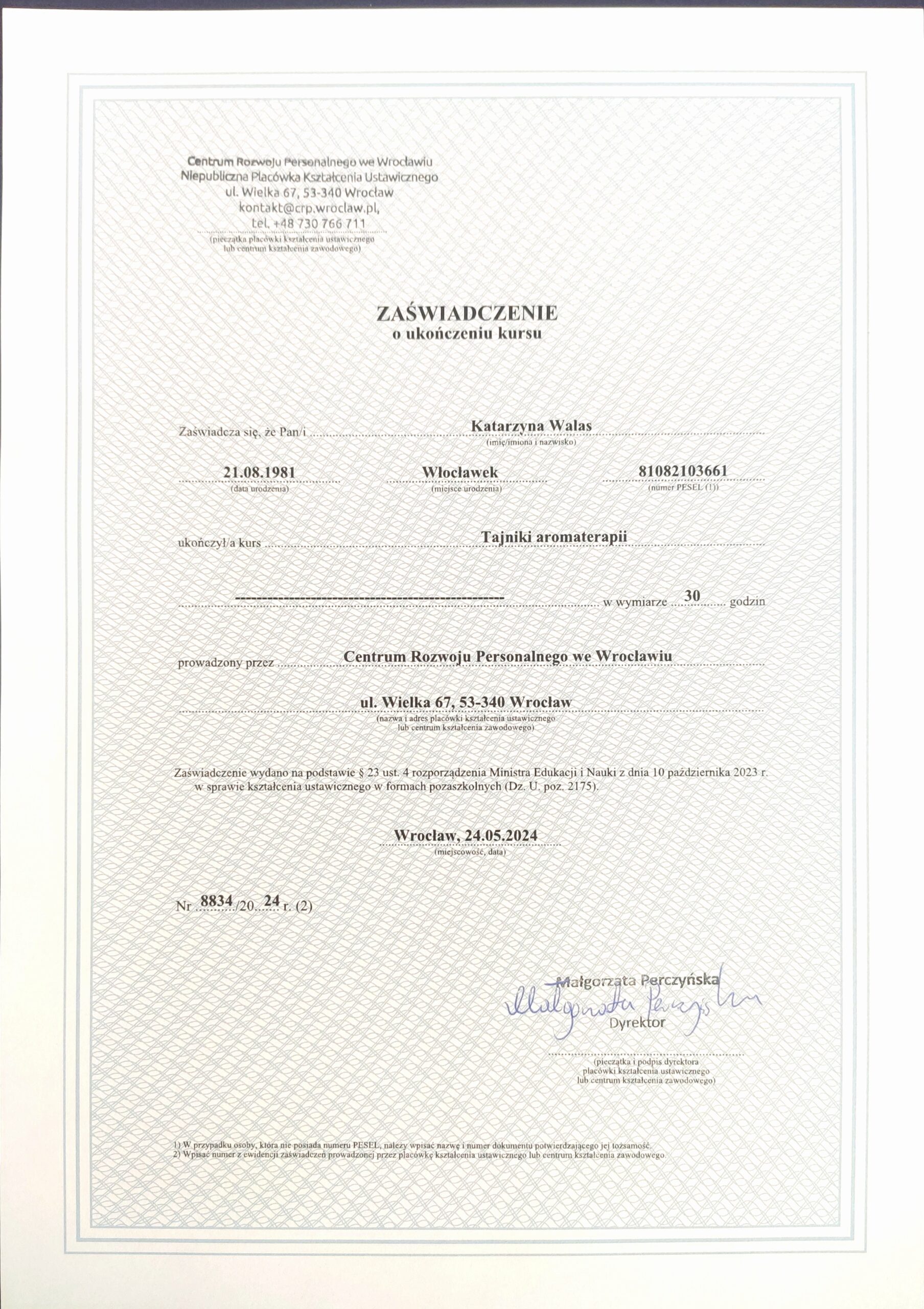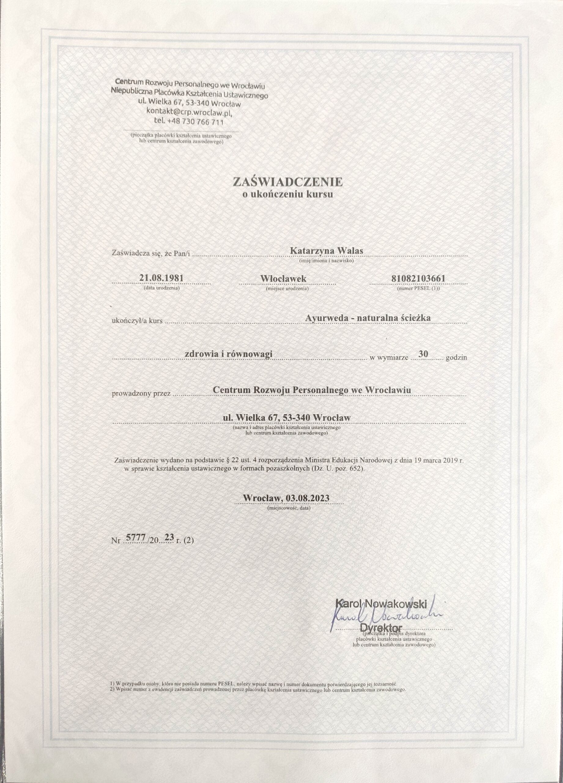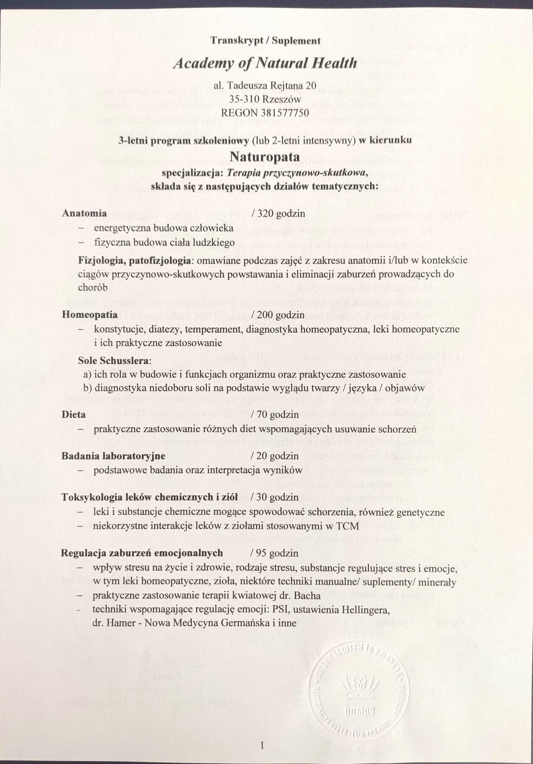 Ponadto ukończyłam również liczne certyfikowane kursy – Praktyk terapii śmiechem, Interpretacja wyników badań krwi, Pozbądź się skutecznie pasożytów jelitowych, Tajniki aromaterapii, Probiotyki i prebiotyki, Autoakupresura – jak poradzić sobie z uciążliwymi bólami głowy, Ayurweda – naturalna ścieżka, Hortiterapia, Kurs Czakroterapii i inne. W dalszym ciągu regularnie się dokształcam i biorę udział w kolejnych kursach i szkoleniach.